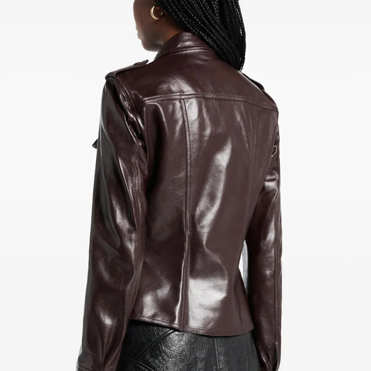 Women's Brown Cropped Leather Trucker Styled Shirt