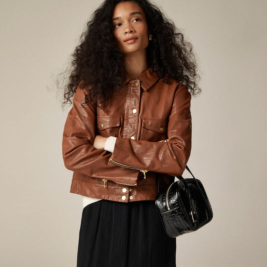 Women Cropped Brown Real Leather Shirt